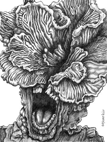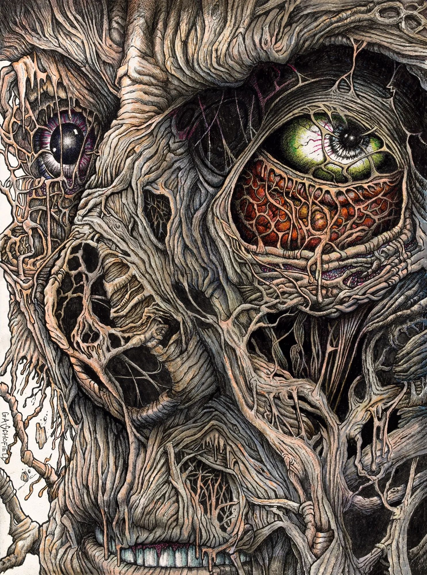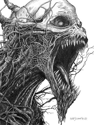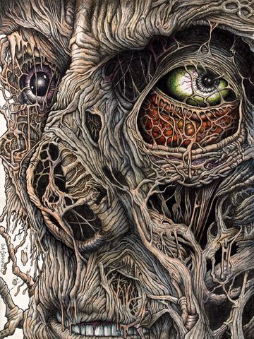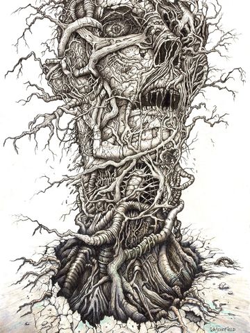 The Pneumii represent a race deeply attuned to their environment, evolving into immense plant-like entities known for their colossal size and longevity. Combining elements of trees, vines, and webs, these beings grow up to a thousand feet tall and can thrive for over a hundred thousand years. Upon death, they continue to exist as a collective consciousness, perpetuating their existence for millennia. The transformation from human to Pneumii involves burial, followed by a sixty-year gestation period, during which the individual's head erupts from the ground and begins its transformation into the iconic plant form.